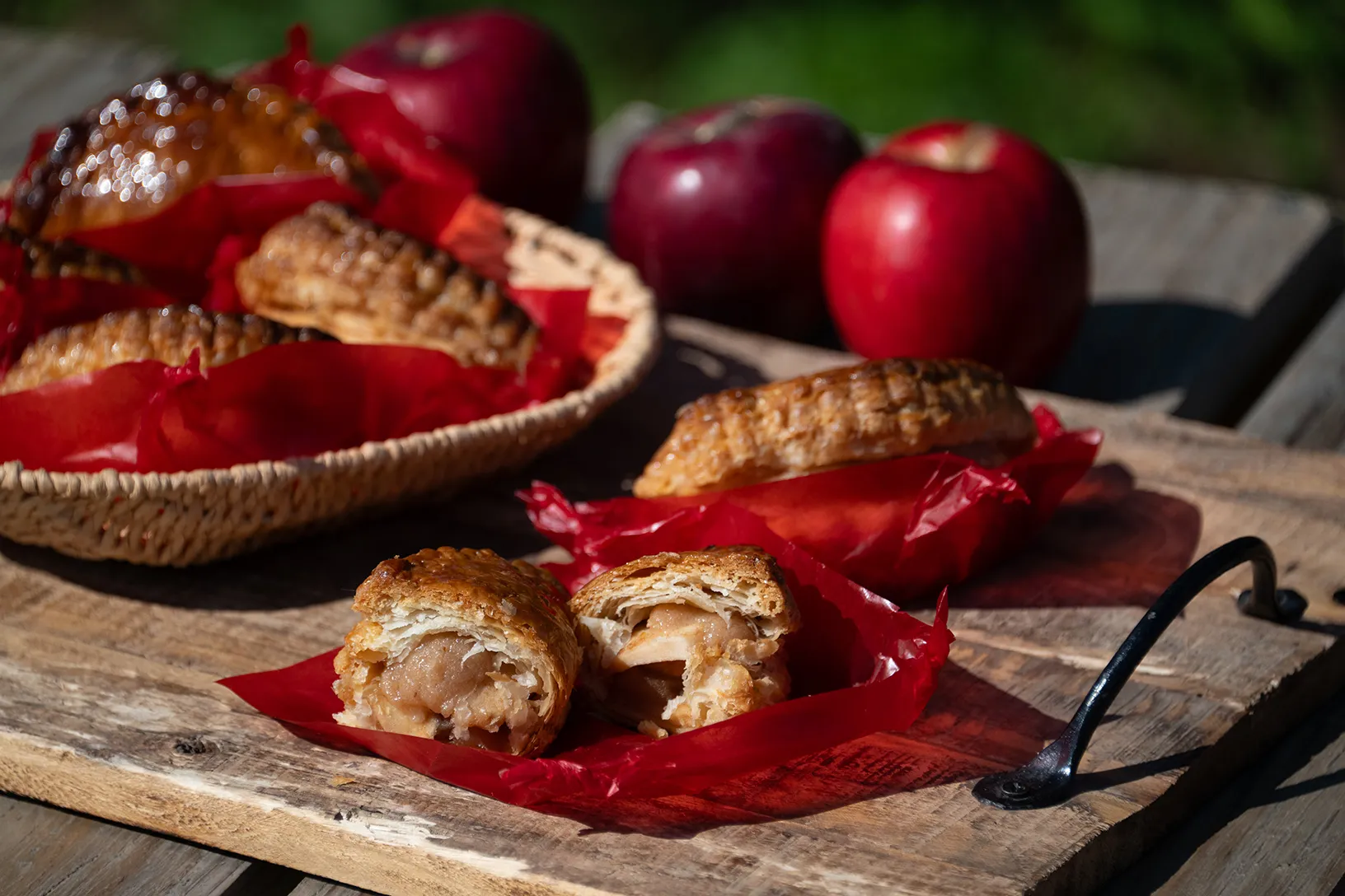 津曲りんごが獲れる時期にしか作れない、特別なアップルパイができあがりました。りんごは熱を加えるとペースト状になるものと、シャリシャリの食感になるものとがあります。その特性を生かし、3種類のりんごを使ったアップルパイを作り上げました。