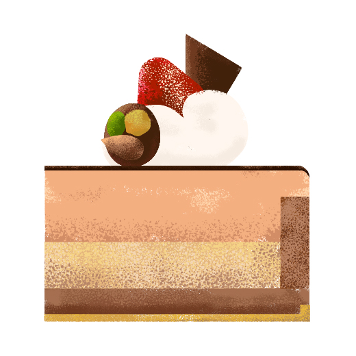 ヘーゼルナッツペーストとドイツリューベッカ社の72%クーベルチュール(チョコレート)を使った自家製コーティングショコラです。香りの特徴はしっかりローストされたヘーゼルナッツの風味ですが、このロースト香がケーキ全体に食欲をそそる布石となっています。
