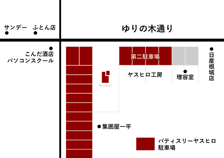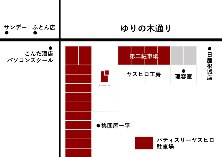 Shop Information店舗情報 トップページ 店舗情報 所在地〒039-1166 青森県八戸市根城7丁目1-26 連絡先Tel:0178-51-6618 Fax:0178-51-6619E-Mail:info@yasuhiro.shop 営業時間8:30~18:00※クッキーのみのご購入希望のお客様は、8:30からご利用いただけます。生菓子は10:00からの販売となります。 定休日水曜日(祝日によっては変動あり)営業日カレンダーをご確認ください。 ご利用可能なお支払い方法について(店舗決済) ※オンラインショップのお支払い方法はこちらをご確認ください。 駐車スペースについて ゆりの木通り沿いに第二駐車場もあります。 Access Mapアクセスマップ
